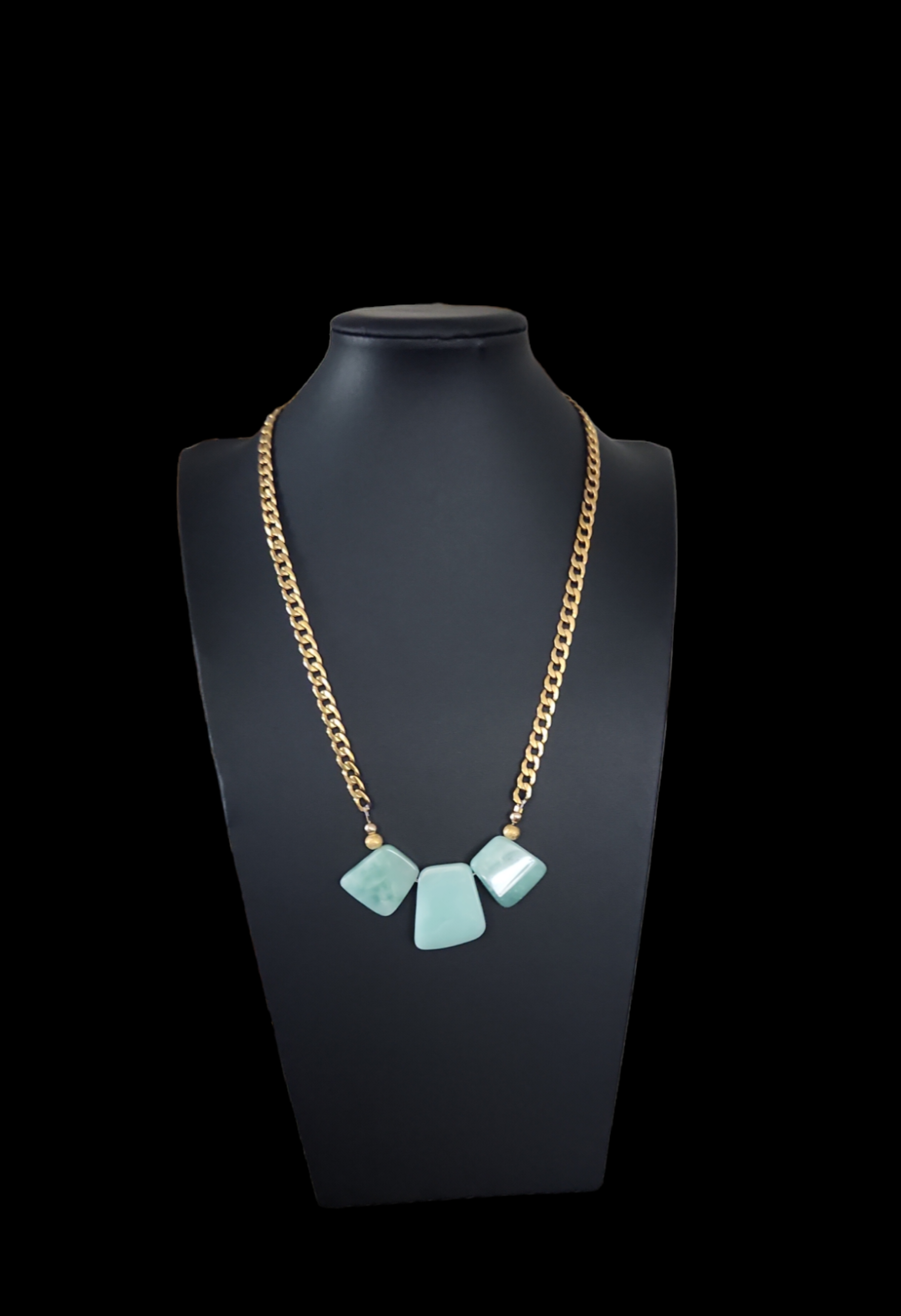 This beautiful 3 stone green Jade necklace is more than just a piece of jewelry. Symbolizing gentleness, serenity, harmony and balance, jade brings energy and good luck to its wearer. 11" necklace with 3 jade stones and stainless steel chain, this necklace is perfect for accentuating any look and adding a peaceful energy to your life.