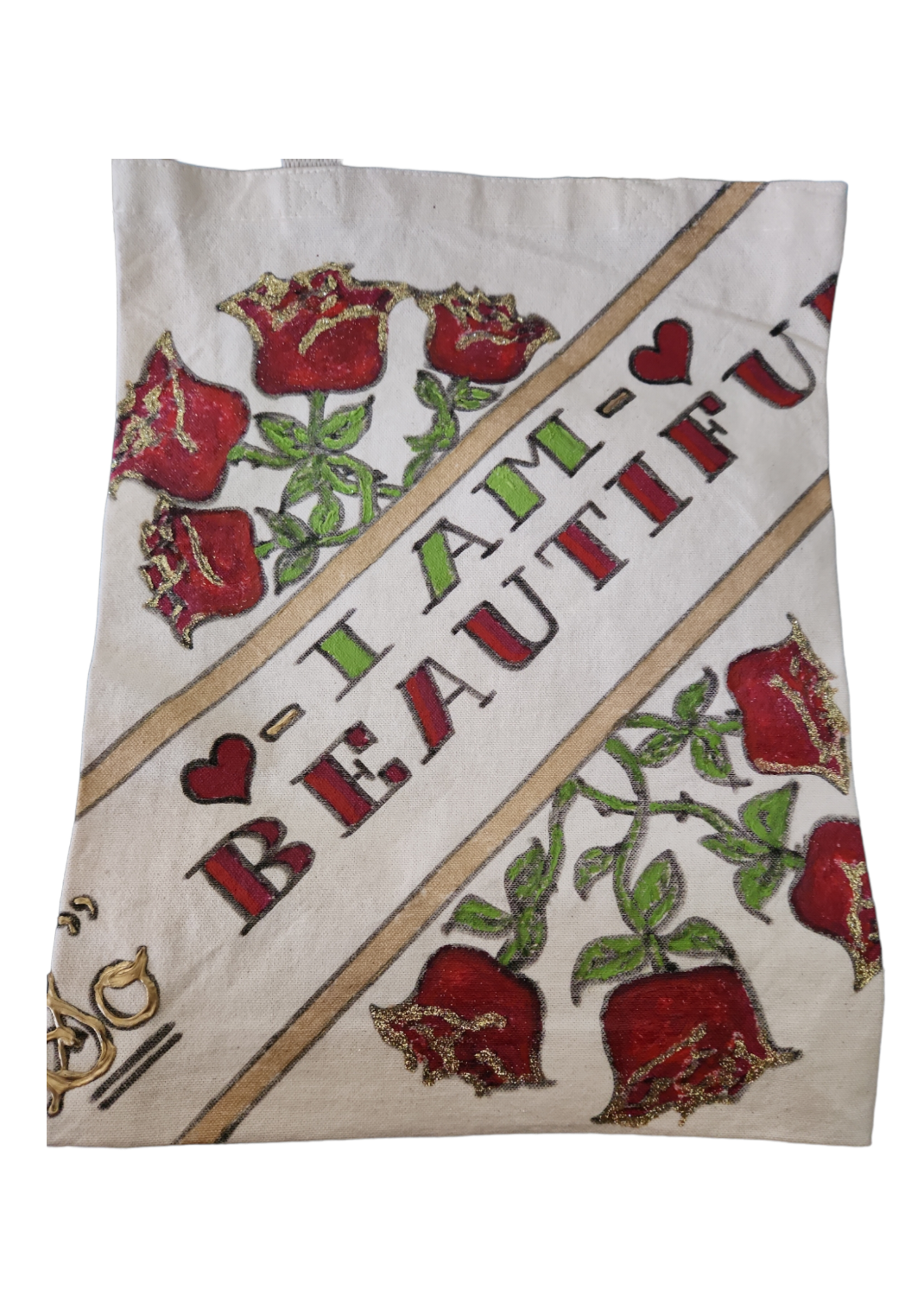 We all need a reminder of our inner beauty - our I Am "so" Beautiful affirmation tote bag with roses is here for that! Painted on both sides, this 12" wide, 16" long bag comes with a 20" shoulder strap, and ships out ASAP.
