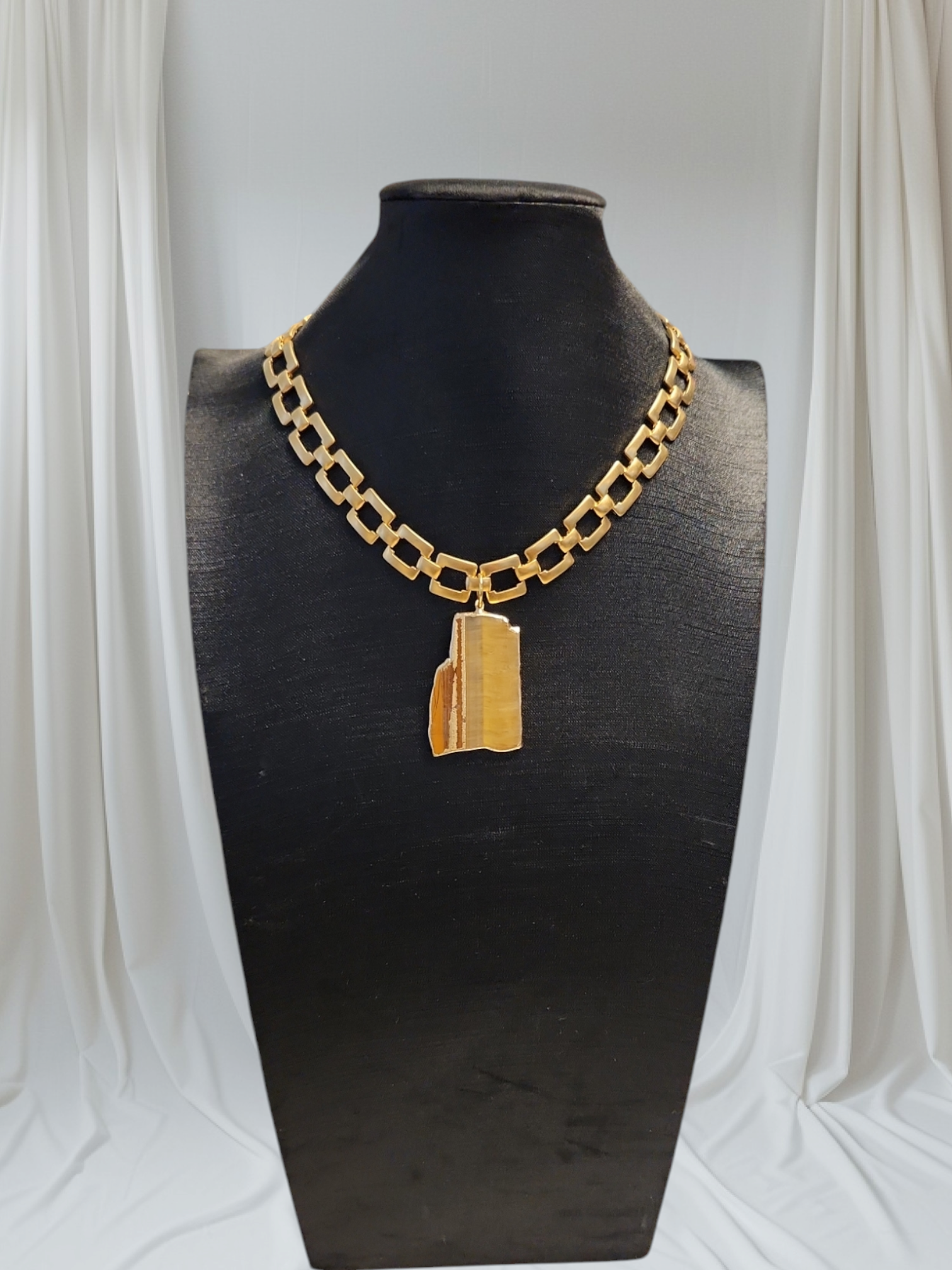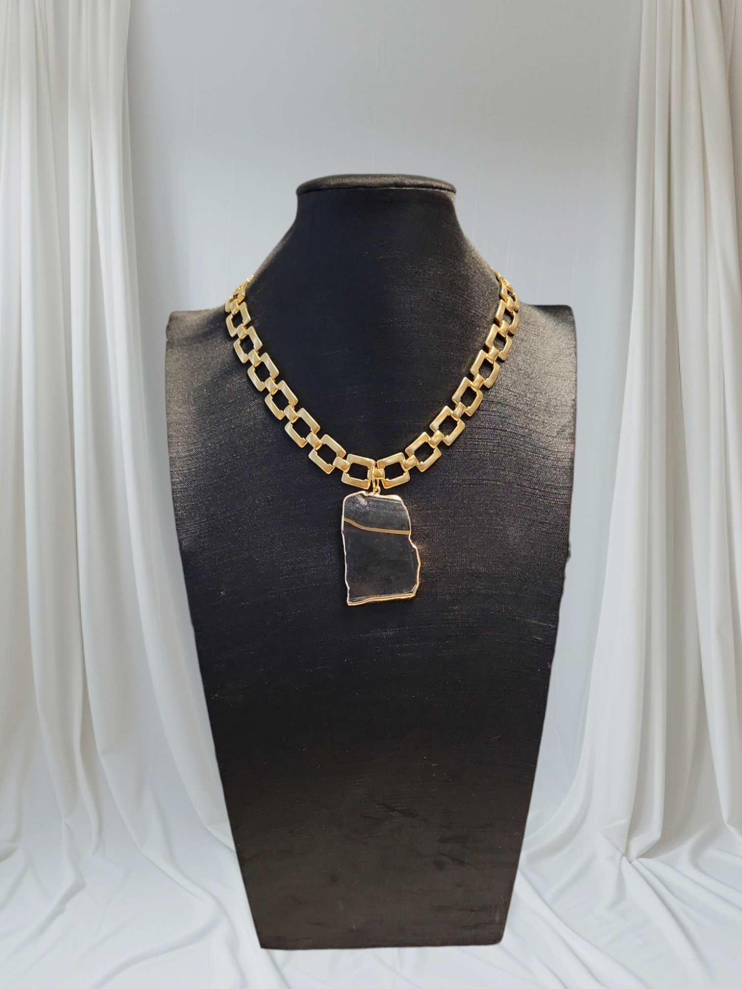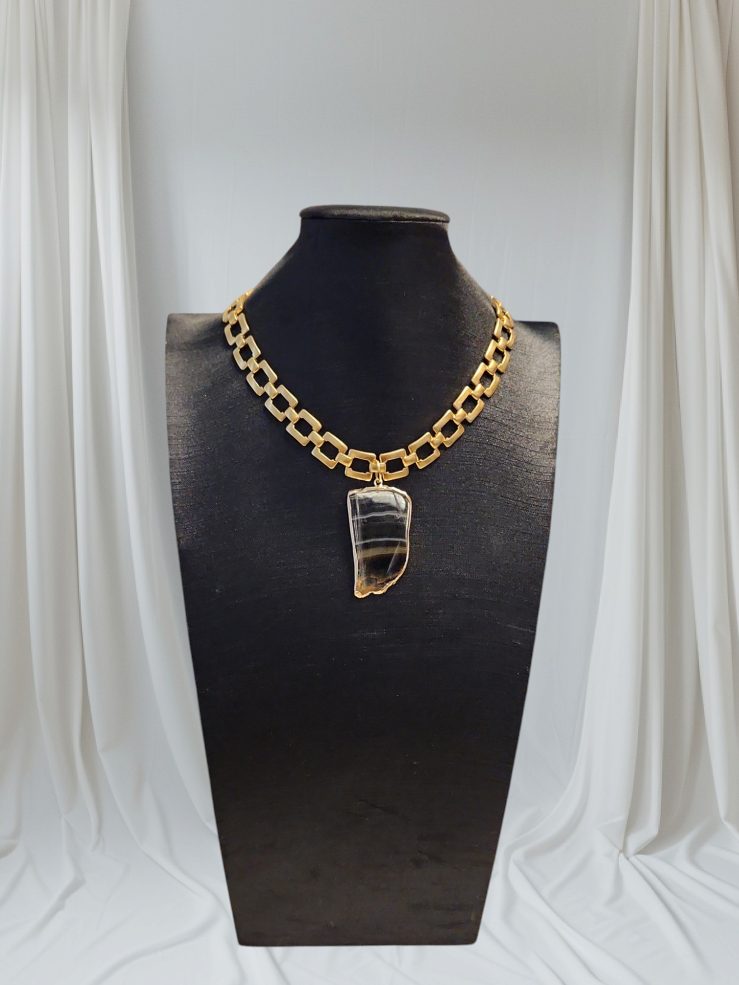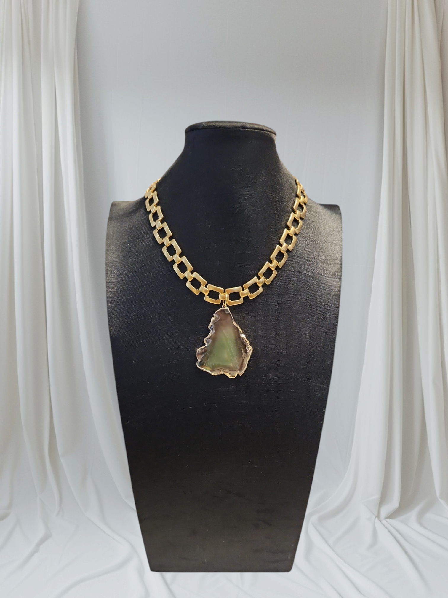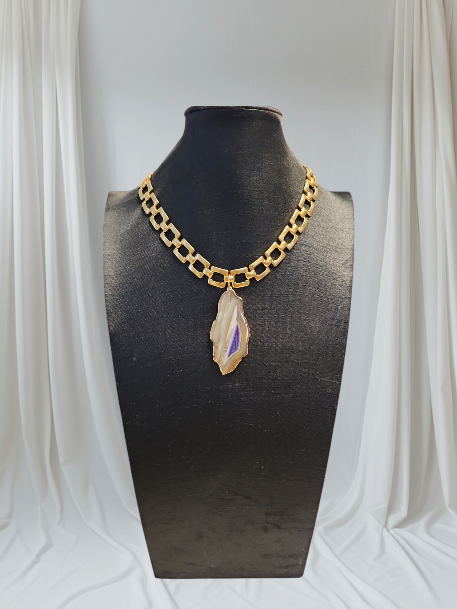 Discover the natural charm of our Agate Choker Necklace. Made with vintage gold chain and a unique agate slice, this necklace adds a touch of elegance to any outfit. Show off your inner expert with this one-of-a-kind piece. Made with vintage gold plated brass, Choker is 16".