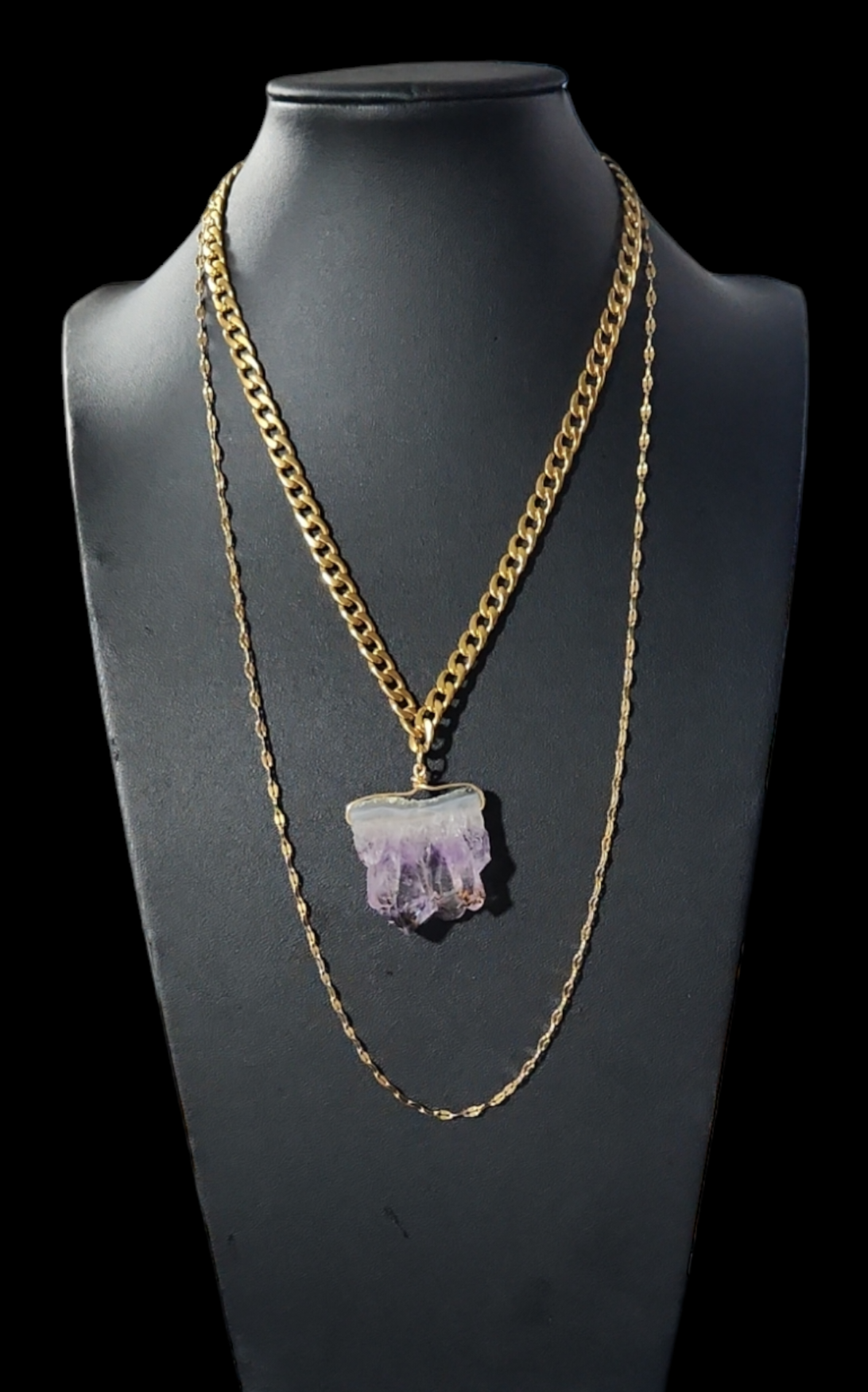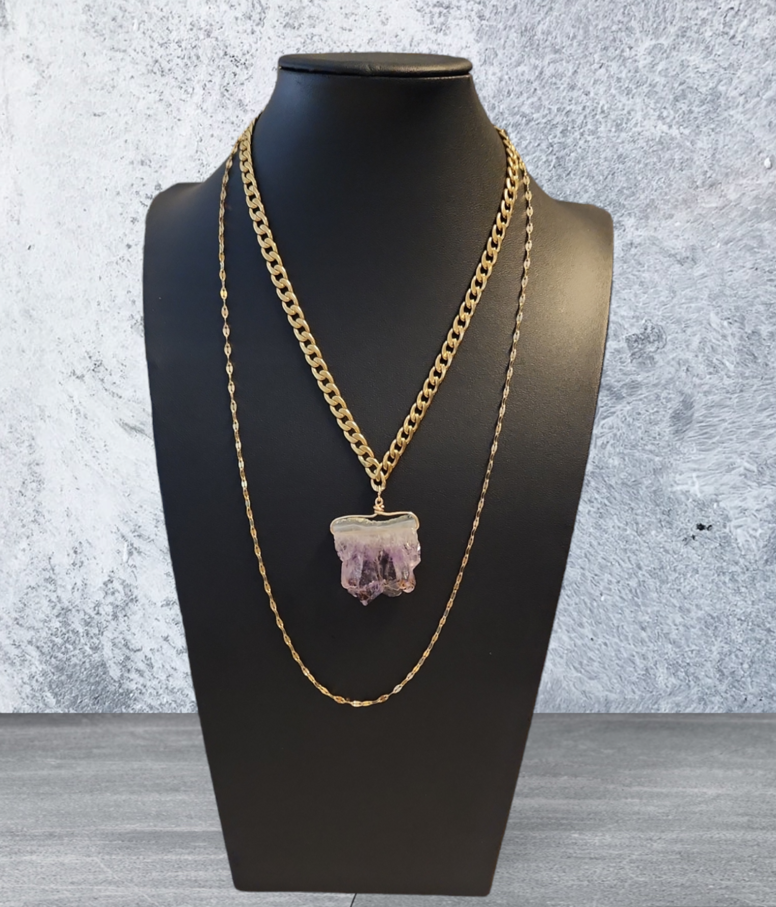 Add a touch of elegance to your outfit with our Amethyst Slice Necklace. Made with high-quality, gold coated stainless steel, this necklace is both durable and luxurious. The amethyst slice adds a pop of color and is believed to promote balance and calmness. Elevate your style with this stunning piece.