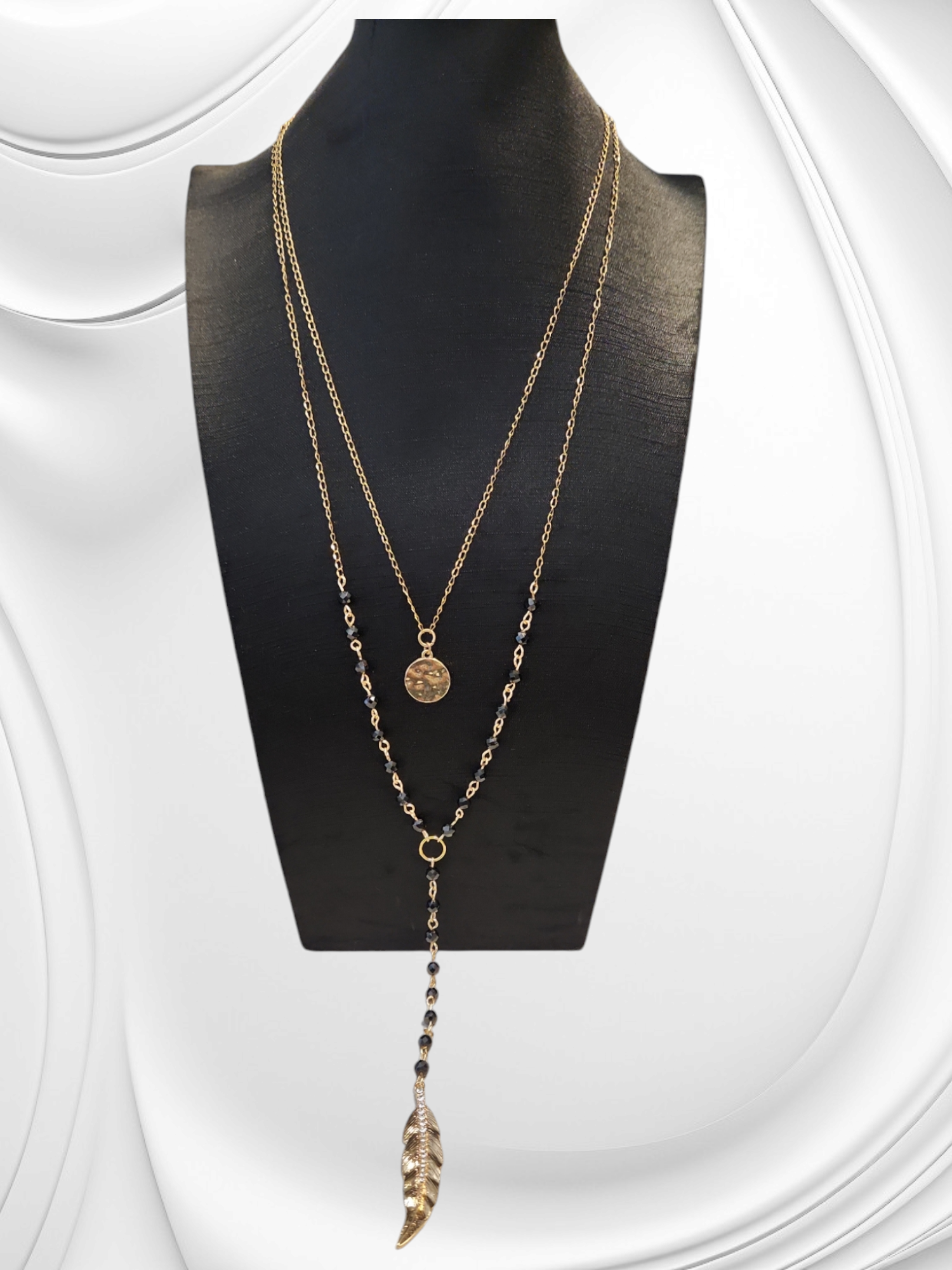 This Black Spinel necklace features a unique "Y" double chain design with a delicate feather pendant. Made of high-quality Black Spinel gemstones and gold coated stainless steel, it adds an elegant touch to any outfit. The elongated length adds a modern twist to a classic style. Perfect for both casual and formal occasions.