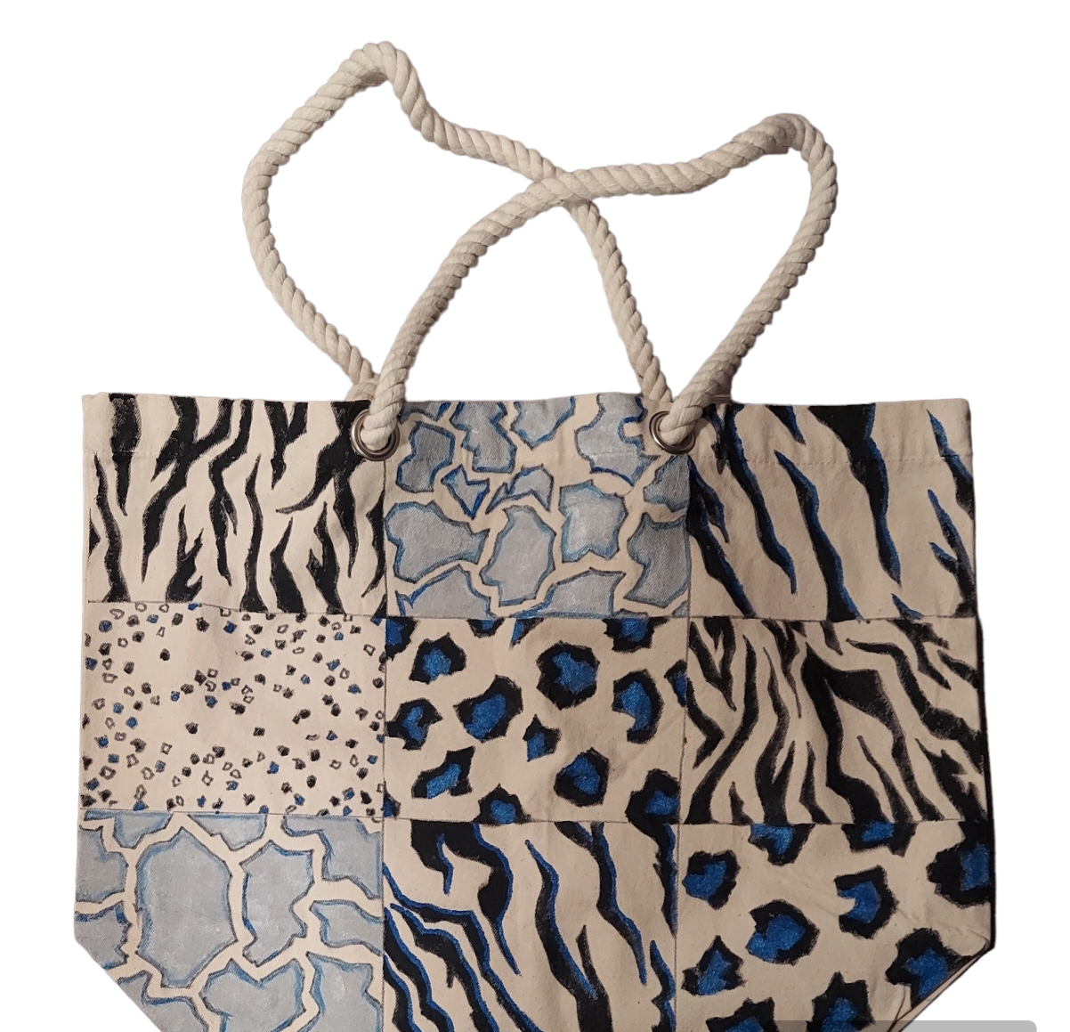 This stylish blue, silver and black animal print tote bag is the perfect accessory for any occasion. The 19.5" wide, 14" length bag with a 26" rope strap offers a generous size capacity along with an inside pocket complete with a zipper for secure storage. Snap the metal button to close up your belongings in style. Available to ship immediately.
