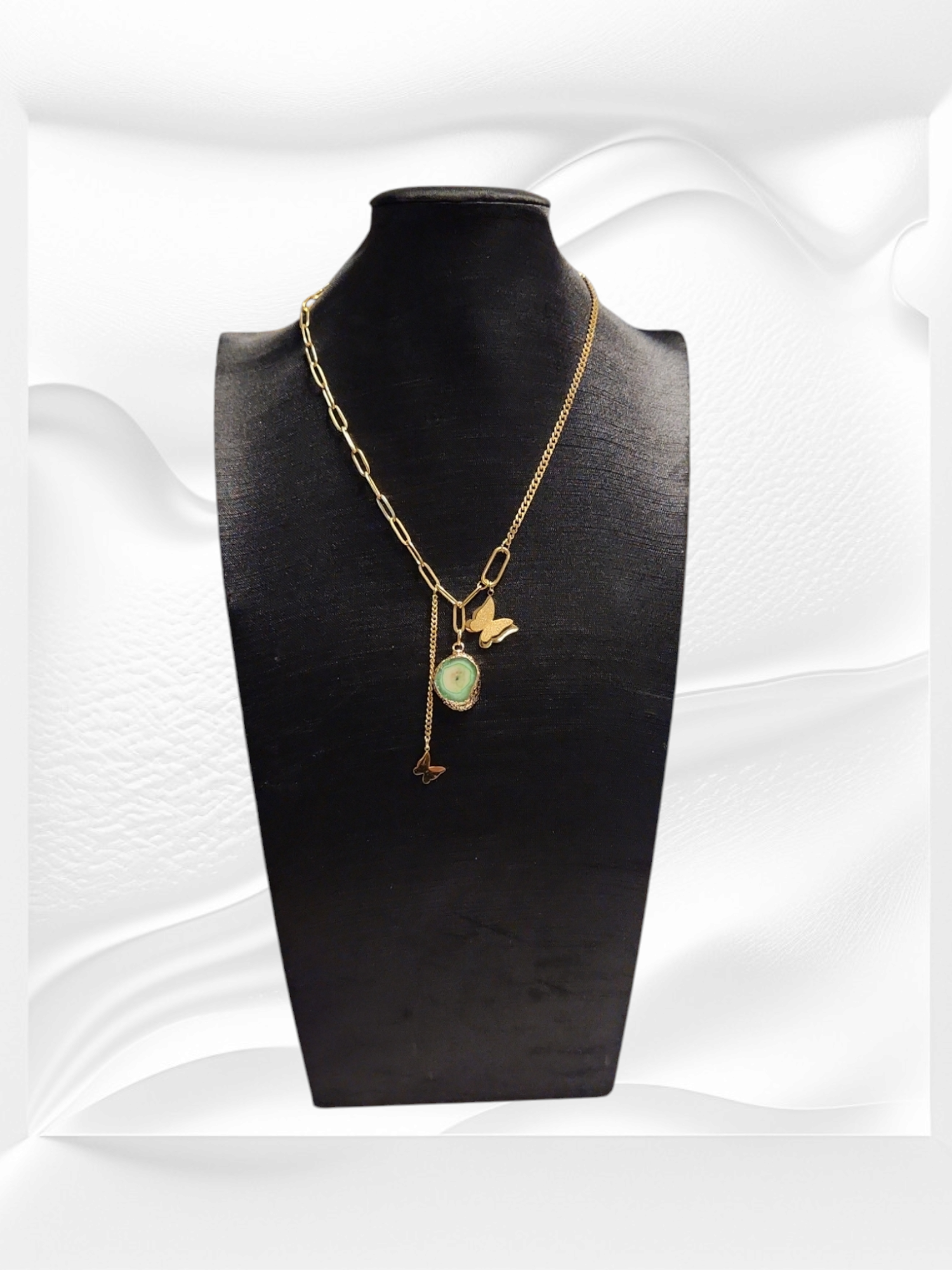 Discover the delicate beauty of our Butterfly and Green Agate Necklace. Made with a gold-plated stainless-steel chain, this necklace exudes elegance and charm. The intricate butterfly design paired with the soothing green agate stone is the perfect addition to any outfit.