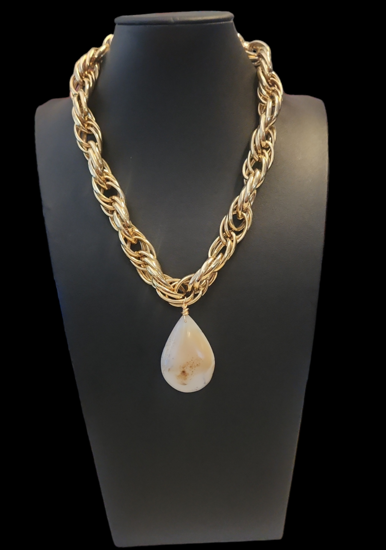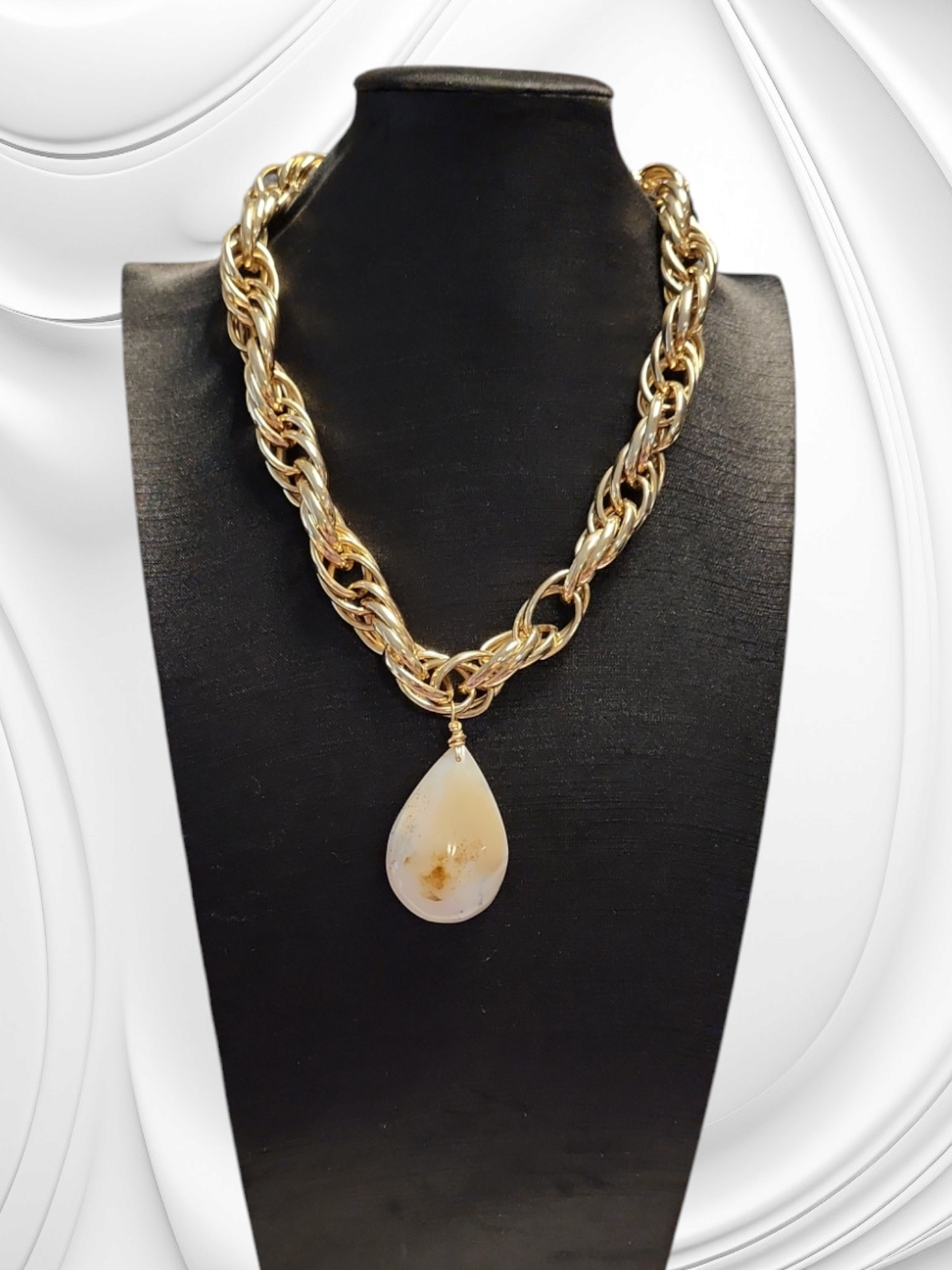 This Chunky Agate Necklace boasts a stunning and unique design featuring chunky agate beads and a delicate gold chain. The bold and elegant combination is sure to elevate any outfit. The agate beads offer natural energy and balance, making it not only a beautiful accessory but also a beneficial one.