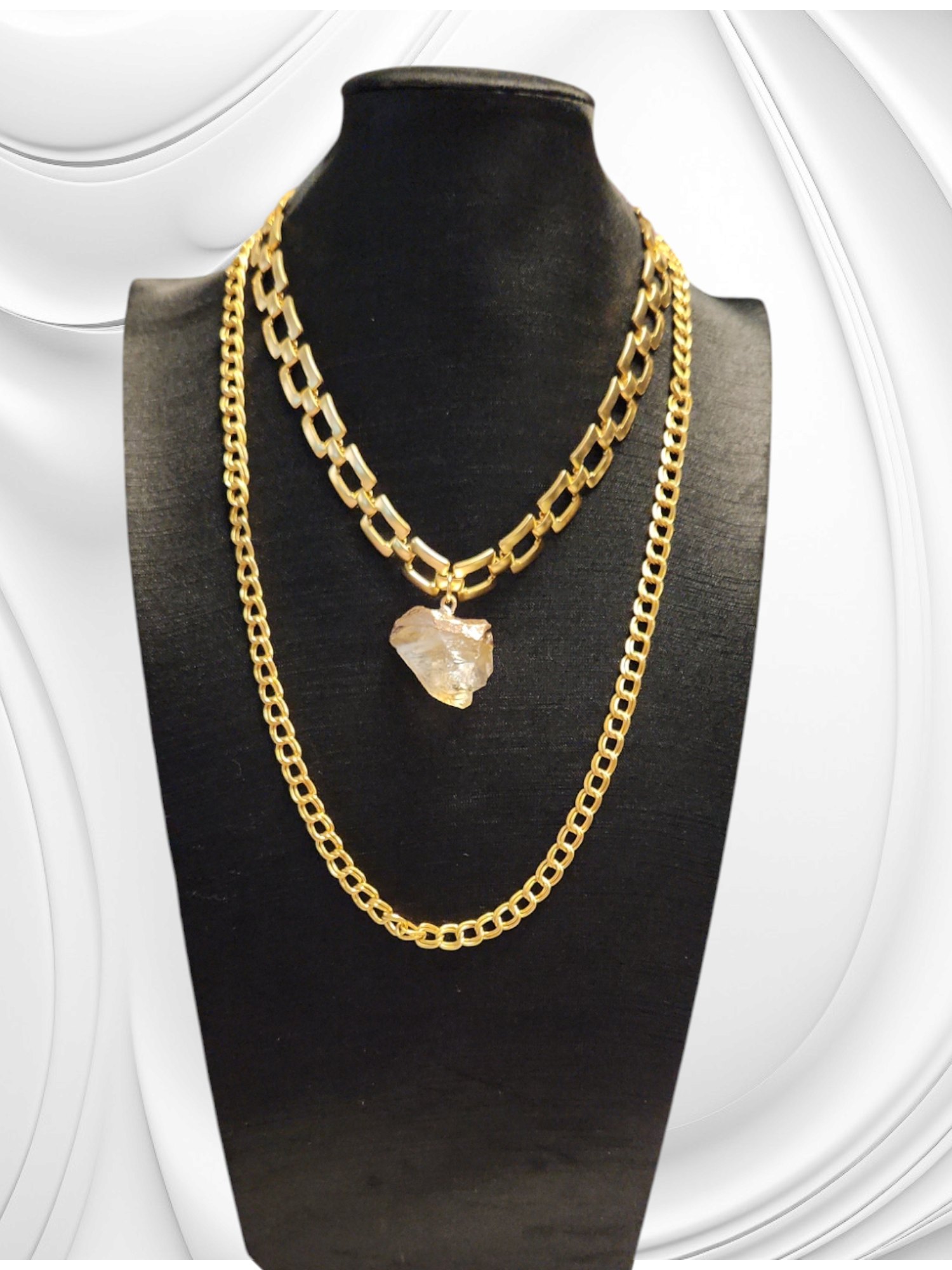 This Citrine Double Chian Choker necklace is expertly designed to add a touch of elegance and sophistication to any outfit. The double chain provides a unique and eye-catching look, while the citrine stones offer a beautiful pop of color. Made with high-quality materials, this necklace will surely become a staple in your jewelry collection.Made with vintage gold plated brass chain, Choker is 16".