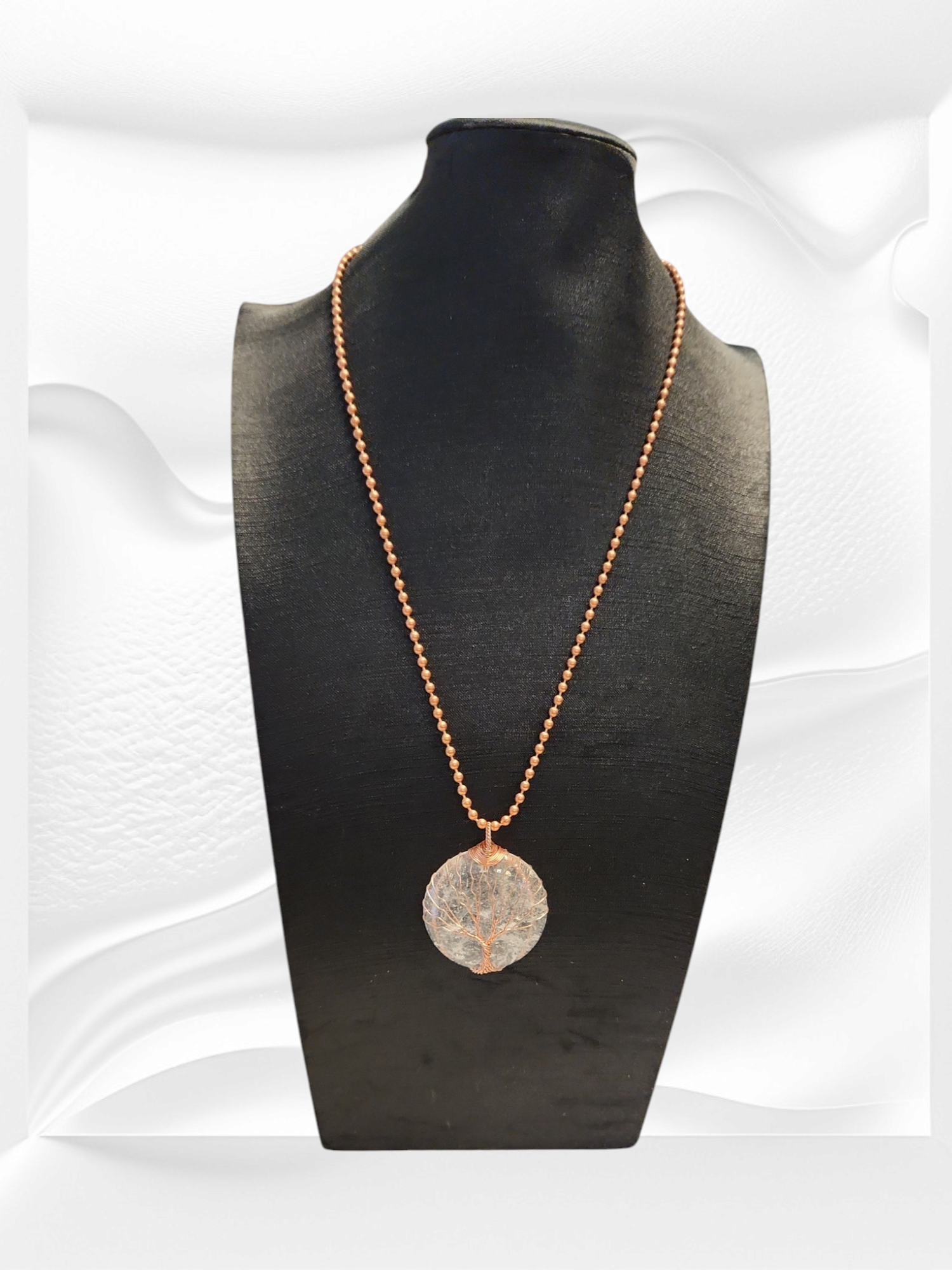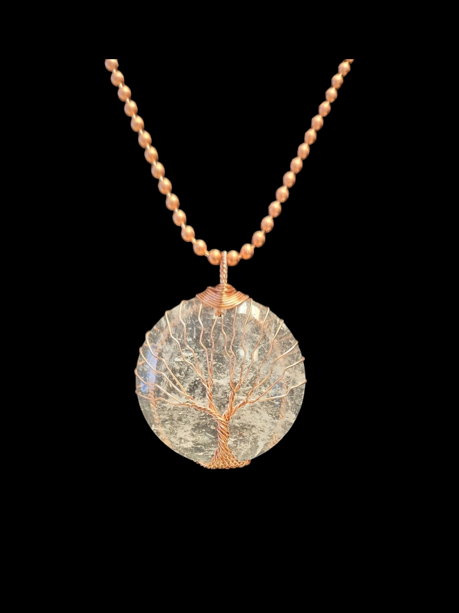 This Clear Quartz copper necklace features a stunning tree of life design, making it a beautiful addition to any outfit. With a 22" chain and 1.5" pendant, it is both elegant and eye-catching. Clear Quartz is known for its healing properties, promoting clarity and positivity. Elevate your style and well-being with this unique necklace.