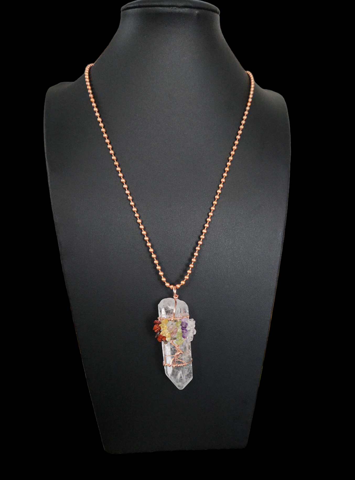 This Clear Quartz wrapped copper necklace will add an elegant touch to your look with its crystal tree of life charm. Enjoy the energy-amplifying properties of clear quartz and benefit from its manifesting powers to help bring your goals to life. Necklace is 14" long including the crystal.