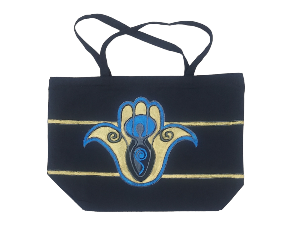 This large, beautiful black tote bag features a Hamsa design with a goddess symbol inside. It measures 22" wide, 15" long, with a 25" shoulder strap and a zipper, plus it's ready to ship right away.