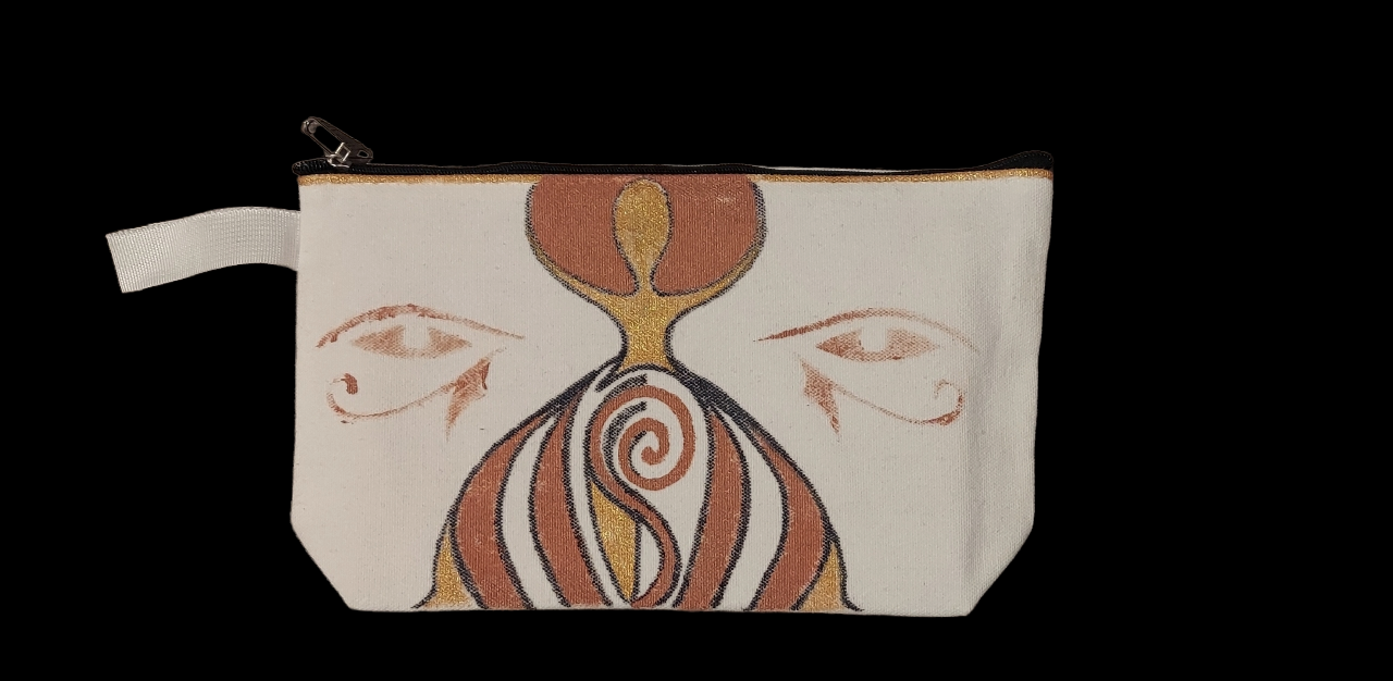 This 10"×6" small makeup bag or pencil pouch comes with an eye of rah and a symbol of goddess design. It has a 5" strap for easy carrying. Bag is available to be shipped immediately.