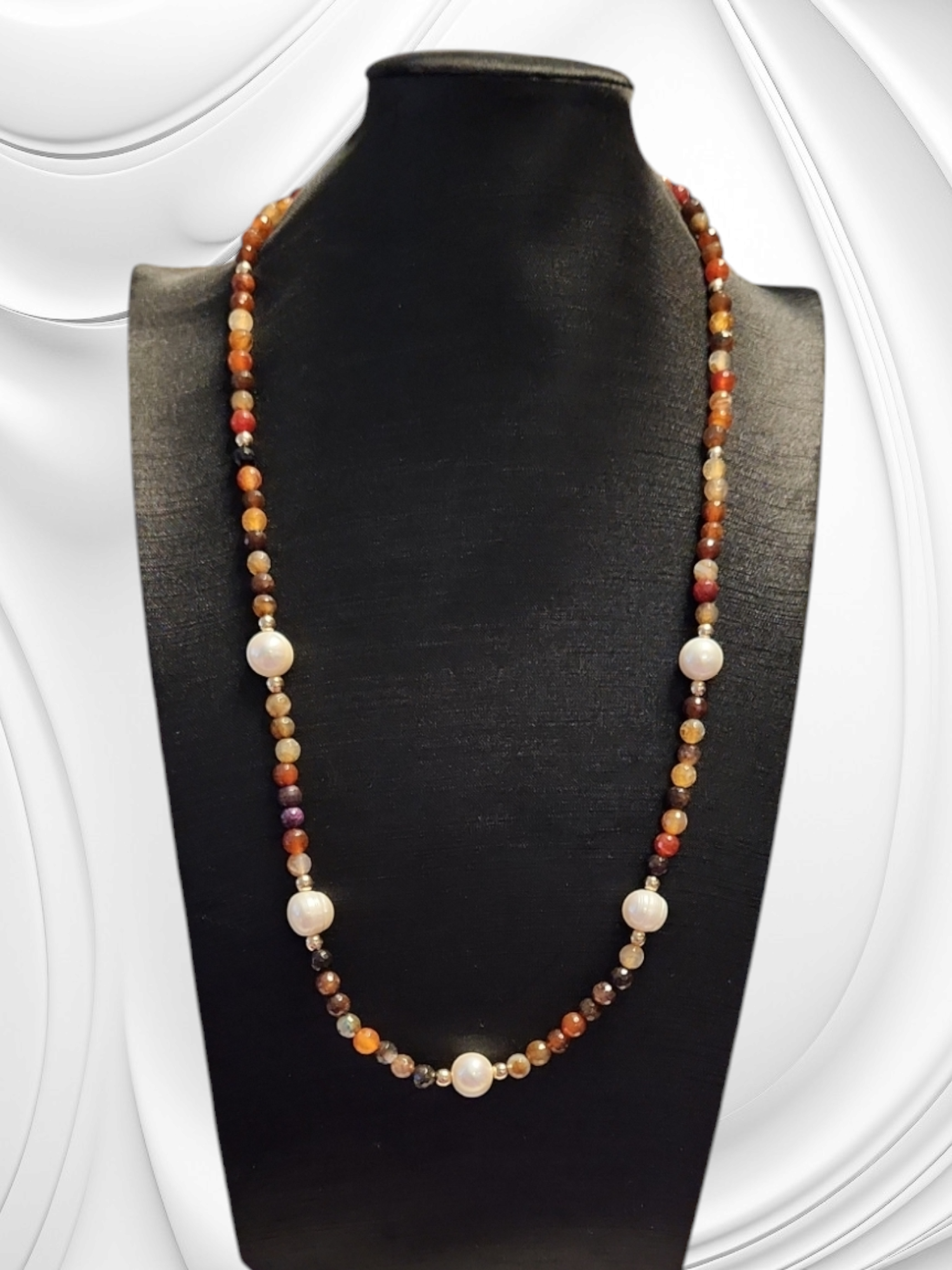 Wear a beautiful reminder of balance and harmony with this Fresh water pearls and agate necklace. The Freshwater Pearl helps regulate hormones and emotional well-being, while the Agate stabilizes and grounds. Embrace the wisdom and power of nature with this stunning piece. Necklace is 25"" long.