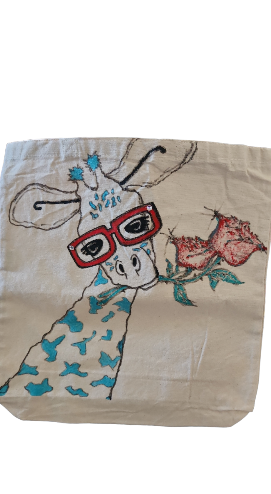 This fab hand-painted Giraffe tote-bag with its red glasses and red roses is a must-have! It will take one week to paint and ship. This bag measures 12" across and 16" in length, with a 20" strap and no zipper. Bag will take a week to make and ship.