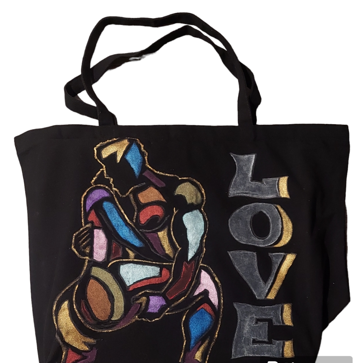 This stylish tote bag will carry everything you need in comfort and style. Boasting a 25" shoulder strap and zipper closure, you can feel secure knowing all your belongings are safe and look great. Show off your love with the Hold Me Close Love tote bag. Bag is 22" wide, and 15" long. Available to ship immediately.