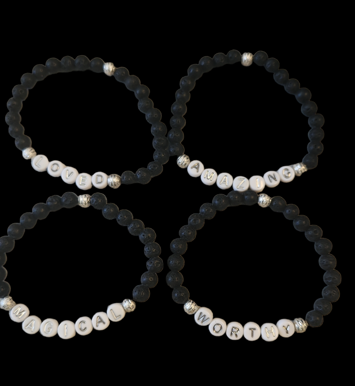 Gain the strength and courage to make a positive change with these "I AM" Affirmation Bracelets. Made from light-weight silver and white materials, each bracelet is also adorned with lava stone, a grounding stone that helps you make that connection to mother earth. Wear these bracelets and take the power of self-affirmation with you wherever you go.