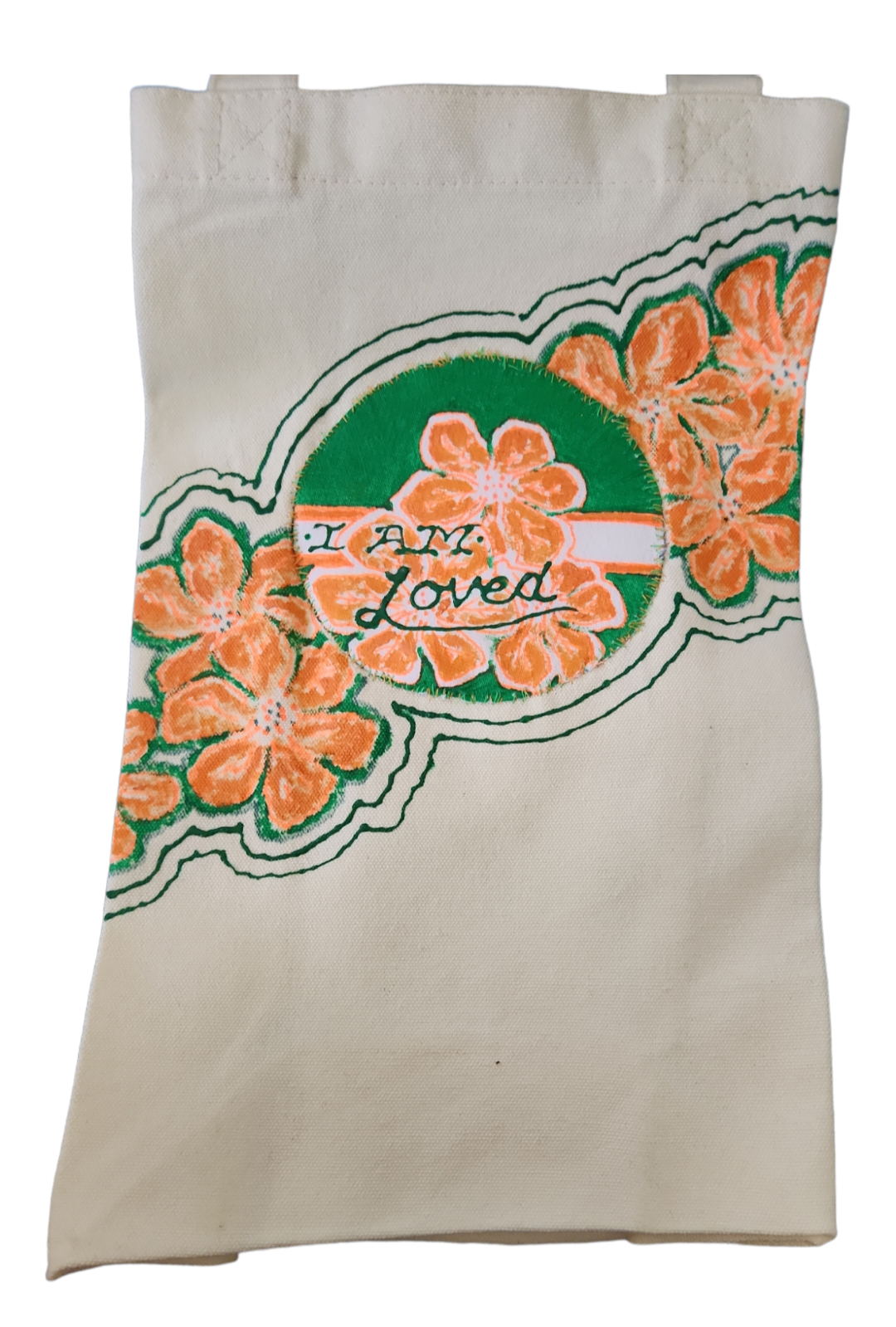 Adorn yourself with this vibrant, hand-painted I AM Loved Affirmation tote bag! Orange and green hues adorn the patch to make a stunning statement. Ready to ship, this 12" wide, 16" long bag comes with a 20" strap and an inner pocket.