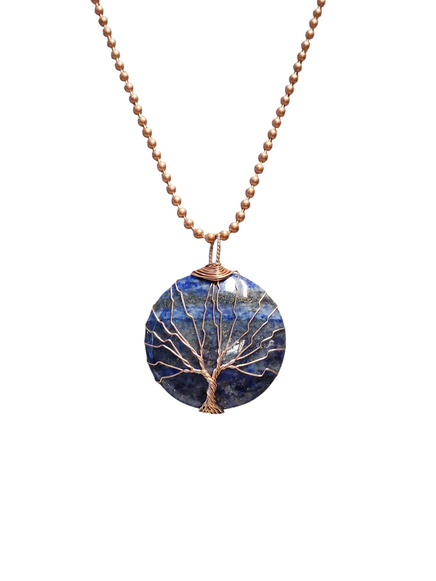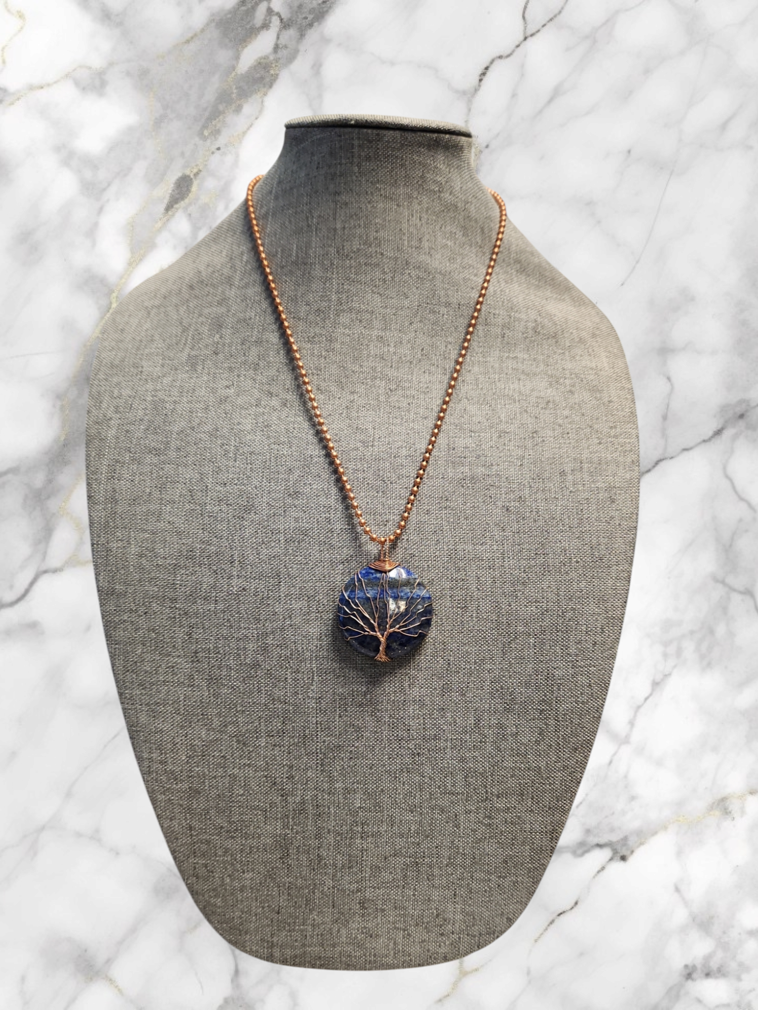 Expertly crafted for elegance, this Lapis Lazuli Copper wrapped necklace showcases the stunning beauty and healing properties of the gemstone. The copper wire wrapping adds a touch of sophistication and aids in conducting energy. Unleash your inner peace and positive energy with this exquisite accessory. 23" copper chain with 1.5" pendant.
