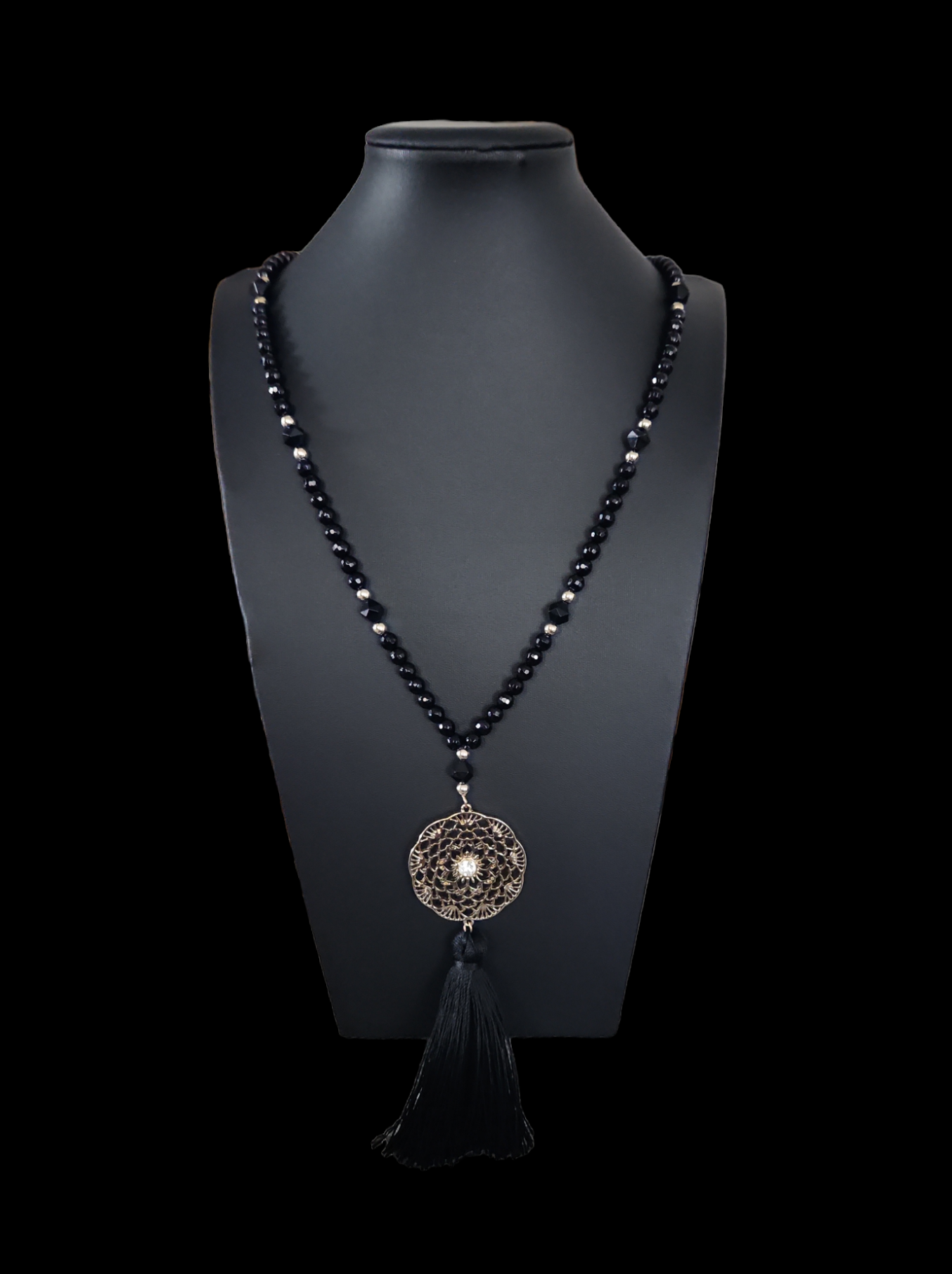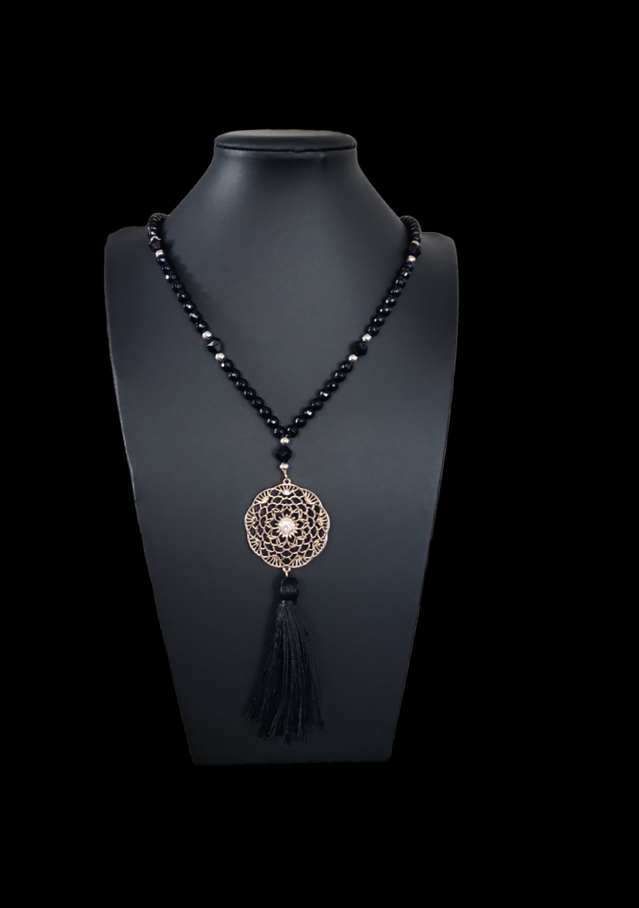 This long onyx necklace and earring set makes an elegant addition to any wardrobe. The onyx stone is known for its ability to absorb and transform negative energies, making it the perfect companion for those who are in need of a little extra support and strength. The necklace is 21" from toggle to tassel.