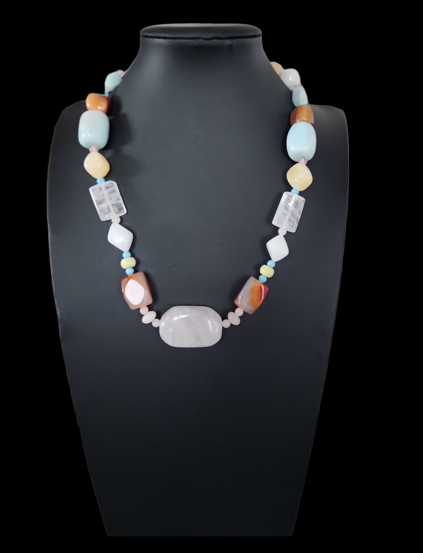 This beautiful 9.5" multi crystal necklace features rose quartz, agate, and amazonite, to help you access the unconditional love and heart chakra energy associated with rose quartz. Let this piece help you to find your inner peace, harmony, and unconditional love.