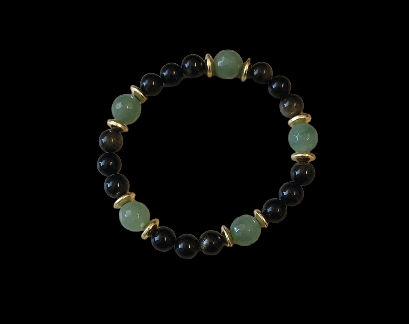 This delightful bracelet features the powerful duo of obsidian and green aventurine. The obsidian safeguards its wearer against negative energies and absorbs them all, helping to reduce stress and anxiety. Green aventurine is thought to be the luckiest of crystals, bringing opportunity and prosperity. Wear this bracelet to benefit from these amazing stones.