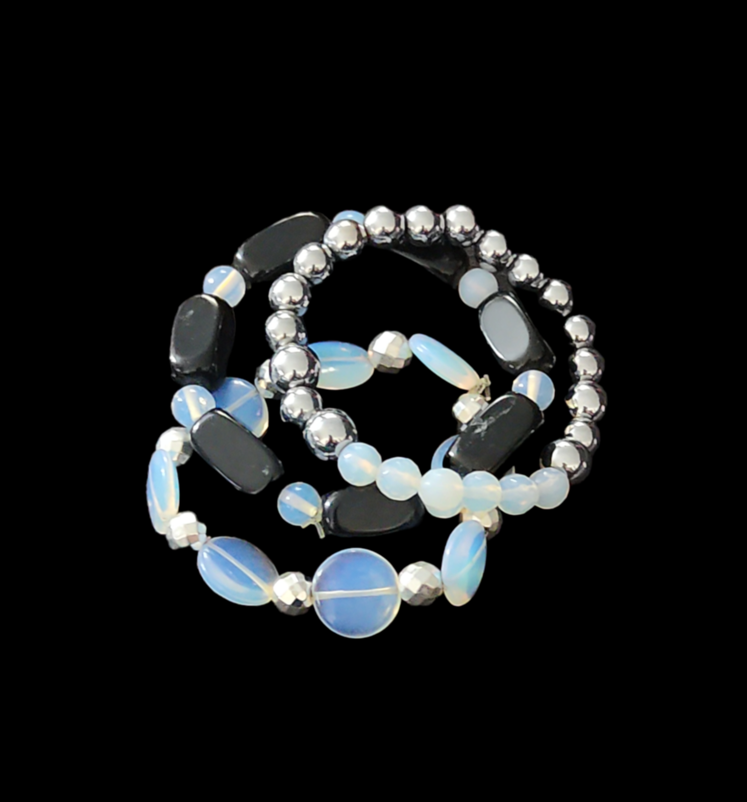 Our Opalite, Onyx & Hematite combination is ideal for those in need of stability and protection. Onyx aids one who is drained of energy, providing strength, stamina, and support. Opalite soothes anxiety and depression while boosting spiritual awareness. Hematite grounds and protects us, keeping us safe, secure, and connected to the earth.