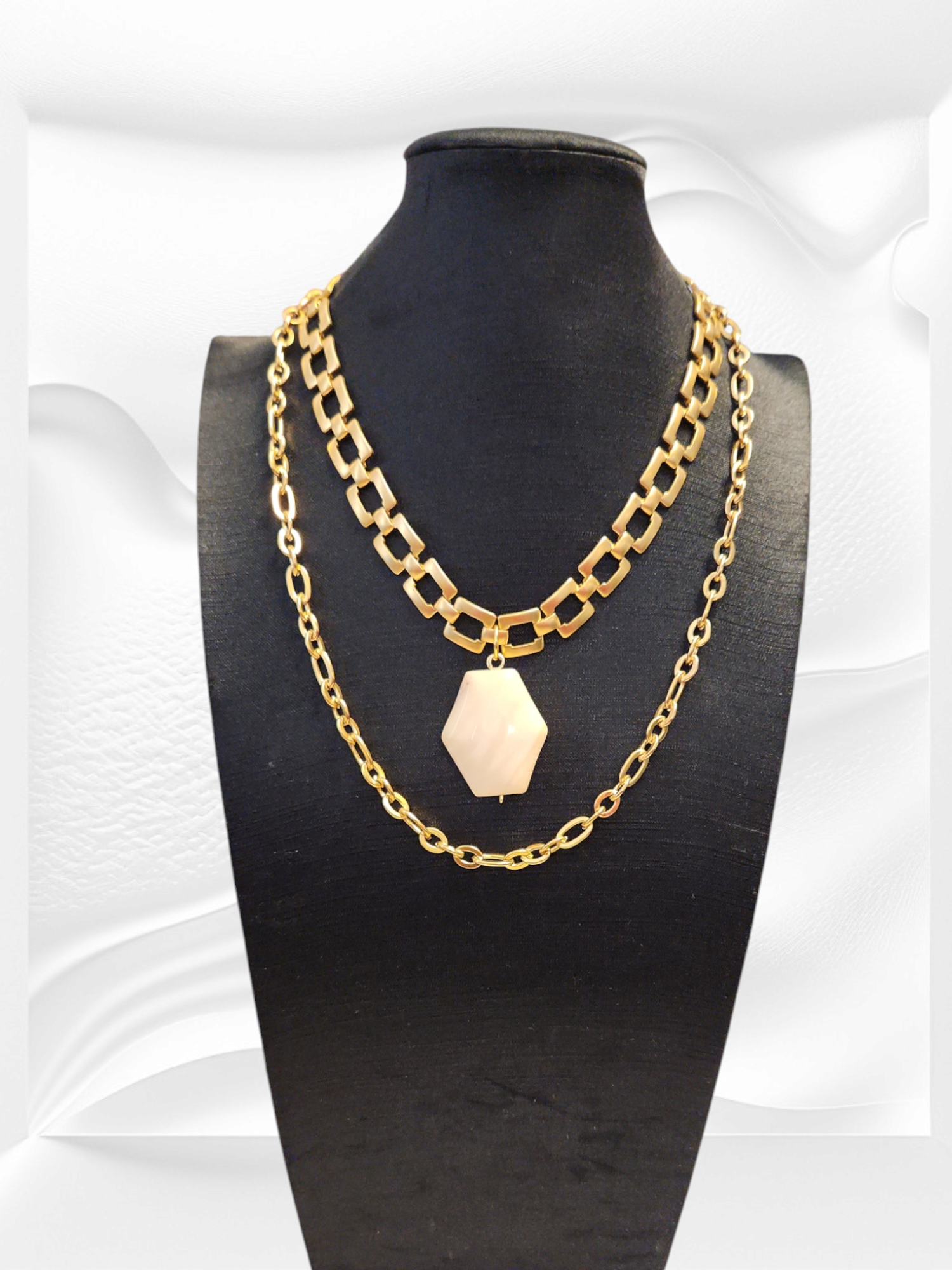 Expertly crafted with rare Peruvian opal, this beautiful double chain choker exudes elegance and sophistication. The opal's unique color variations make each piece one-of-a-kind, adding a touch of individuality to your style. Perfect for any occasion, this choker is sure to make a statement and elevate any outfit. Made with vintage gold plated brass, Choker is 16".