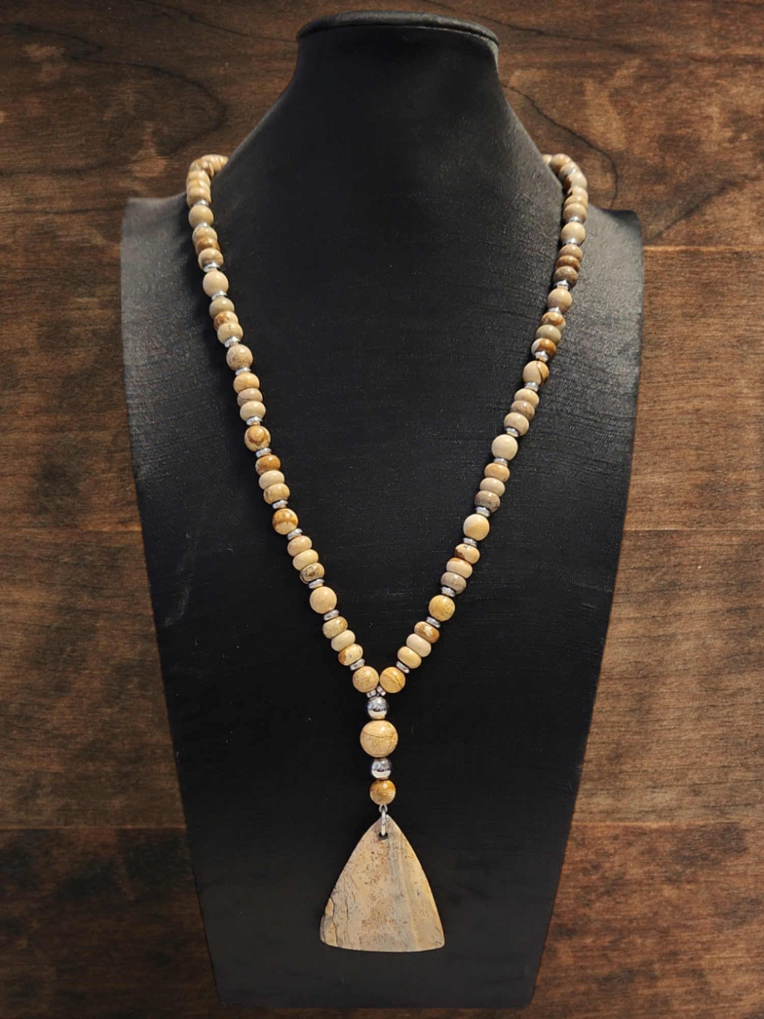Expertly crafted, this Picture Jasper Necklace is a stunning addition to any jewelry collection. The 28.5" chain beautifully showcases the unique 3.5" pendant, made with genuine Picture Jasper stone. Enhance your style with this one-of-a-kind necklace and enjoy its natural earthy tones.