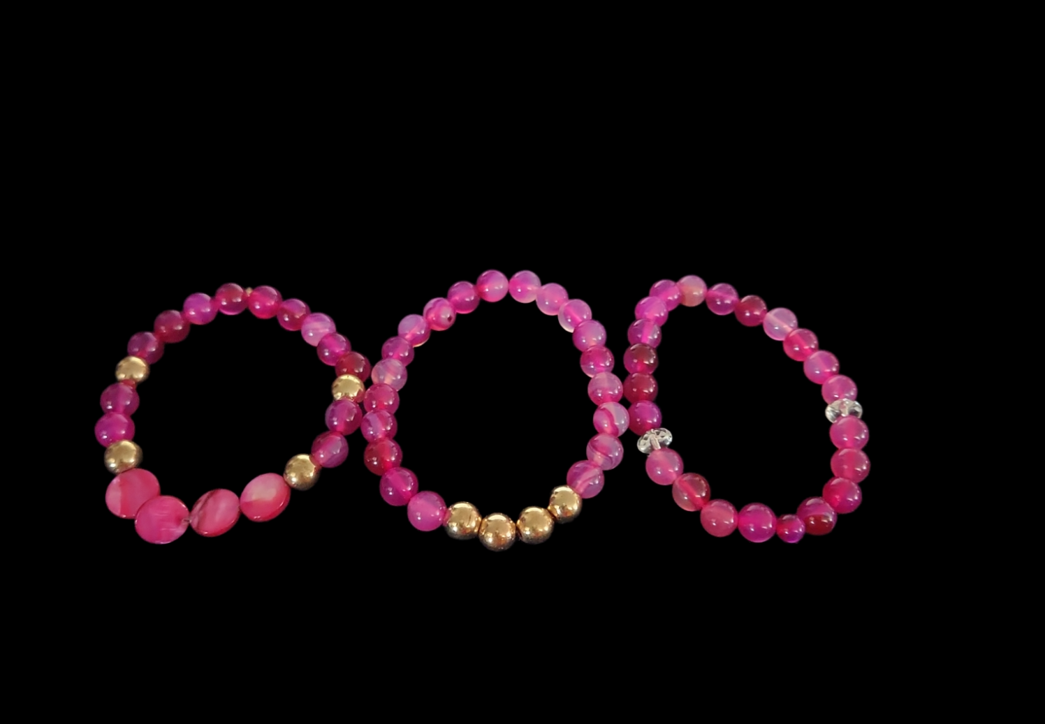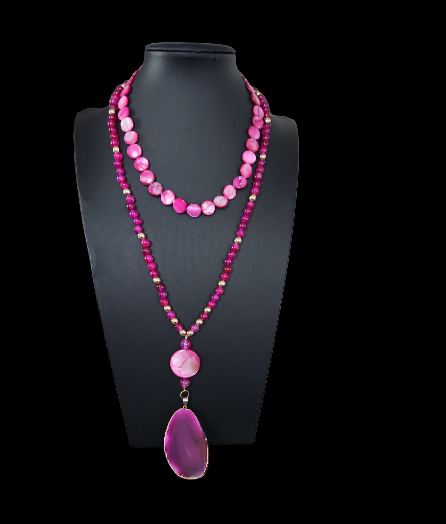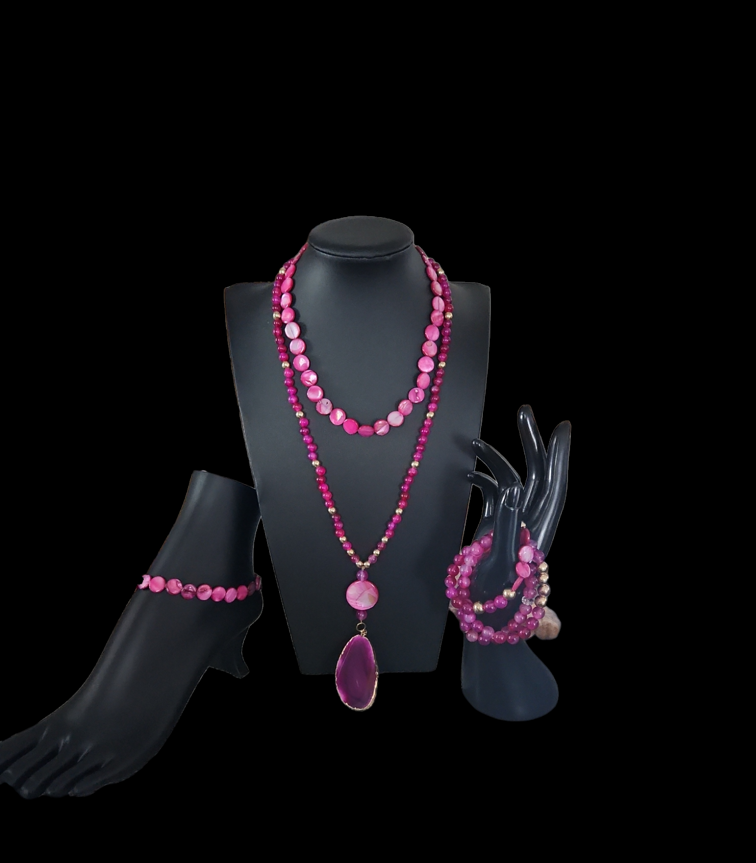 Adorn yourself with this stunning Pink Agate & Mother of pearl Necklace set! Included in the set are a 16" necklace, 8" choker, 10" anklet, and 3 bracelets—all created with agate for stability and strength while mother of pearl brings calming energy. Feel grounded and secure while embracing the courage and confidence to take on life's hurdles.