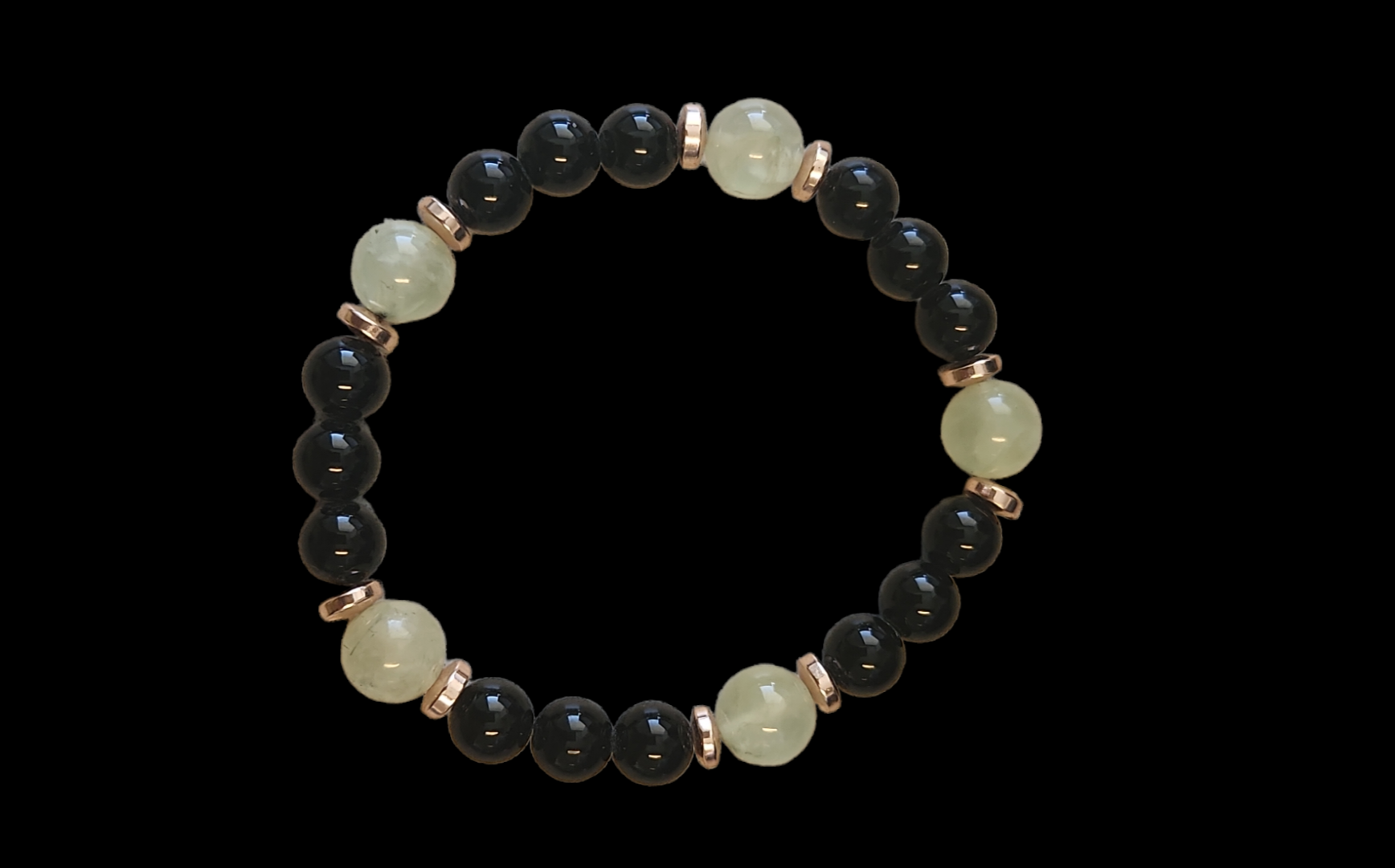 Feel the calming connection with this Prehnite & Onyx bracelet. Prehnite creates an emotional bridge between the heart and the will, while Onyx protects and helps restore the energy of those feeling drained or lacking strength. Let these stones bring you peace and strength.
