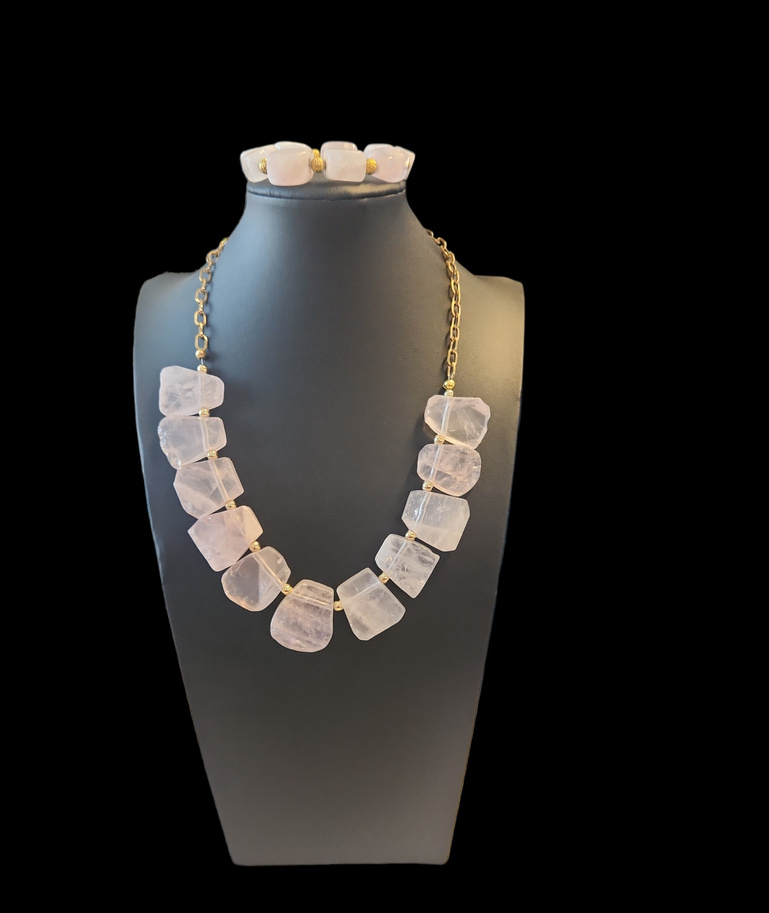 This beautiful 10" Rose Quartz necklace and bracelet set is the perfect way to express unconditional love. Rose Quartz is the gemstone that symbolizes compassion, understanding, warmth, respect, and emotional health. The set is perfect for bringing all these qualities into your life.