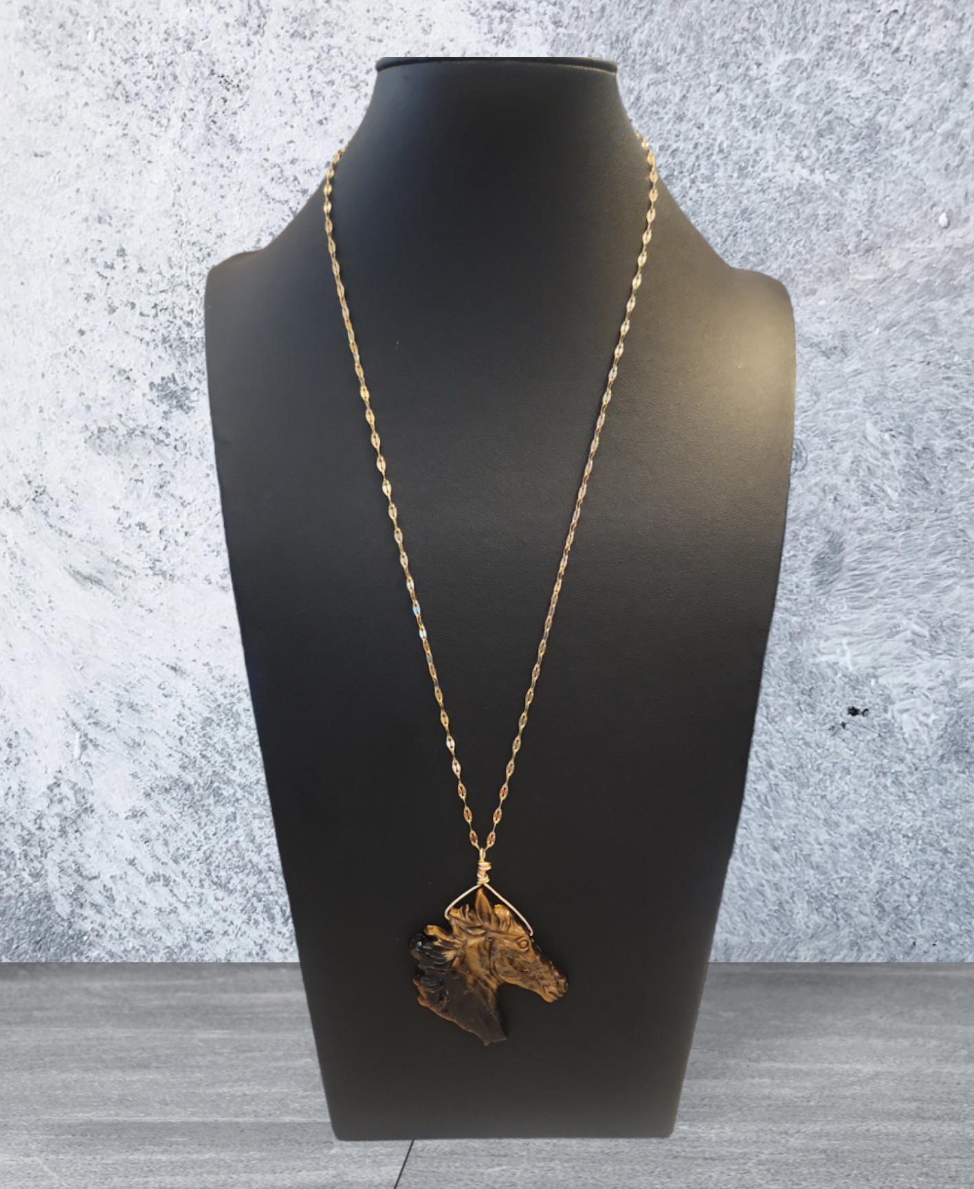 Discover the elegant and timeless beauty of our Tiger's eye Horse Necklace. Crafted with a stunning horse carved out of tiger's eye stone and gold coated stainless steel, this necklace will add a touch of sophistication to any outfit. Made with high-quality materials, this necklace is a must-have for any horse lover or jewelry enthusiast. Necklace is 22.5" in length.